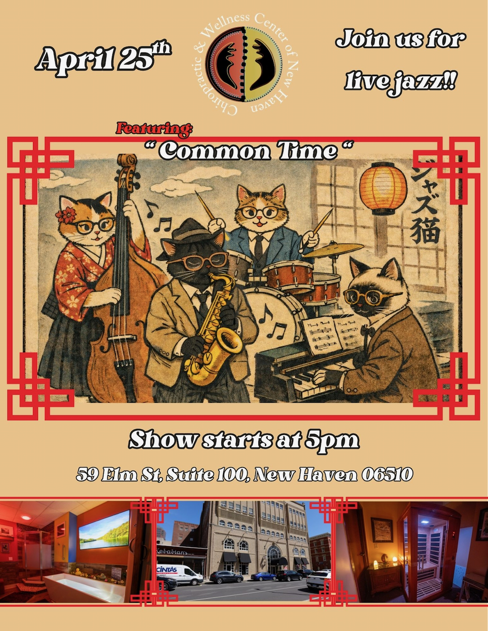 FreeThe jazz group, Common Time, a stellar band of young phenoms, will perform on Saturday, April 25th from 5:00 to 7:00 pm as part of the Chiropractic & Wellness Center’s Open House which begins at noon. As part of the Open House, the Center will be offering workshops in Kundalini Yoga, Yin Yoga w/Massage, Sound bath Reiki and Numerology from noon to 4:45 pm. The live jazz performance follows at 5:00 pm and it’s free to the public. For info: 203-909-6173. https://chiropracticnewhaven.com/